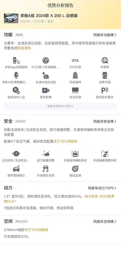 今天给大家带来的车型是奔驰A级(图片|配置|询价) 2024款 A 200 L 动感版,新车含税价为28.61万,现在的二手车报价是16.80万,让利幅度达11.81万,相当于开了1年多有近5折的优惠。该车定位紧凑型轿车,外观颜色为白色,内饰颜色为深色。车源地在温州,上牌地是温州,行驶里程是2万公里,过户次数是1次,牌照是国VI。接下来,让我们详细探讨这辆二手车的各个方面。