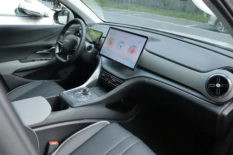 在内饰设计上,新车环绕式海洋律动座舱结合丰富的海洋元素并搭配深色内饰,设计风格比较简约,走的是年轻风格。本次试驾的是顶配,中间采用的是15.6寸的大屏幕。下方配备一个50W的无线快充,可惜的是没有通风功能。