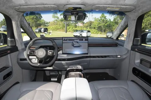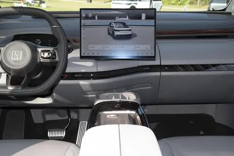 方向盘是平底式的设计。上手比较扎实贴服。电动调节,加热和记忆功能都配上了。用起来非常方便。前挡玻璃和主驾有一段距离,坐在司机座椅的时候视觉感受和轿车不太一样。需要点时间适应。但是这款车坐姿比较高,A柱附近配备了三角窗,提升了前方和侧方视野。而且还配了360°全景影像和透明影像。在车内就可以看到周边路况。路人和凹坑都能清楚看到,要避开就很轻松了。这样一来,不但减轻了驾驶压力,还提升了行车安全。