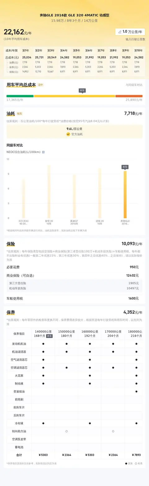 今日为大家介绍的是一款奔驰GLE 2016款 GLE 320 4MATIC 动感型,属于中大型SUV类别,首次上牌时间为2016 年 8 月。截至目前,该车行驶里程为14万公里,优于83%同年款车。该车使用性质为非营运,未曾进行过户,车身颜色为黑色,所在地和上牌地均为杭州。新车指导价为77.8万元,而当前卖家报价为15.98万元。