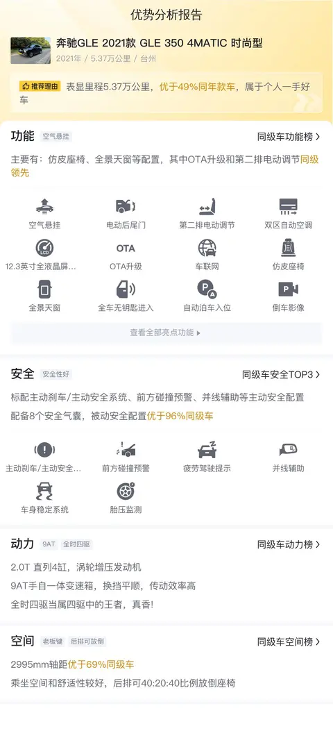 不过,据估算,同级车的最低用车成本是17988元/年,最高是23728元/年,奔驰GLE 2021款 GLE 350 4MATIC 时尚型是21138元/年,所以用车成本不低。