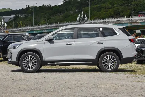 侧面造型方面,车顶略带一点弧度,配备有粗壮的行李架以及鲨鱼鳍,带来了一定的力量感;腰线采用了分段式设计,从前翼子板延伸到车尾,点缀出了车尾的层次感;轮眉和侧裙部分设计有隆起的筋线,凸显了肌肉感;轮毂采用的是多幅式造型,风格还算大气。