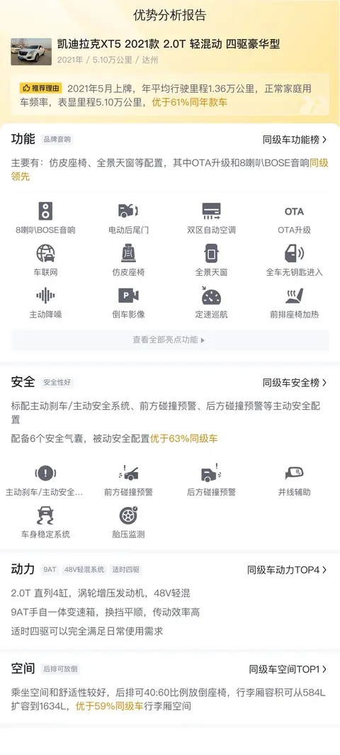 综上所述的新车含税价、用车成本、市场行情、优势分析、同款比价等数据仅供参考。在配置部分,因为二手车非标品,车辆可能会存在配置改装的情况,具体车况信息需要线下结合车辆实际情况进行综合参考。