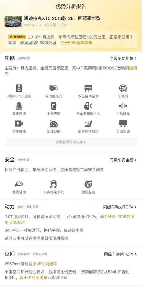 综上所述,这辆二手凯迪拉克XT5 2018款 28T 四驱豪华型不仅在外观设计上展现了凯迪拉克品牌的经典魅力,更在内饰用料、动力性能、科技配置等方面体现了其高品质和豪华感。作为一辆二手车,它有着合理的售价、较低的里程以及良好的车况,为那些追求品质与性价比的消费者提供了一个理想的选择。无论您是商务人士还是家庭用户,这辆凯迪拉克XT5都能满足您在城市驾驶、长途旅行或日常通勤等各种场景下的需求。如果您正在寻找一辆兼具豪华与实用的中型SUV,那么这辆凯迪拉克XT5无疑是一个值得考虑的选项。