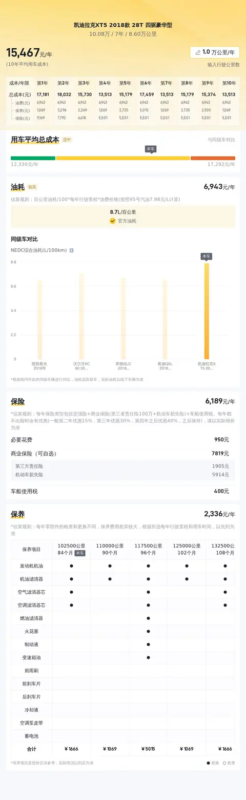 在用车成本方面,根据估算,这辆凯迪拉克XT5 2018款 28T 四驱豪华型的年均综合用车成本约为1.5万元左右。这里值得注意的是,用车成本会根据用车强度和环境等因素有所改变。