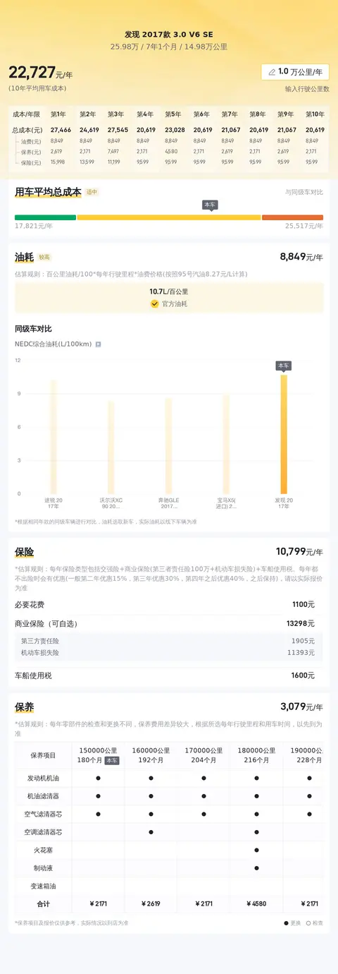 发现 2017款 3.0 V6 SE的10年平均用车成本是22680元/年,同级车的最低是21460元/年,最高是46716元/年,它的用车成本适中。