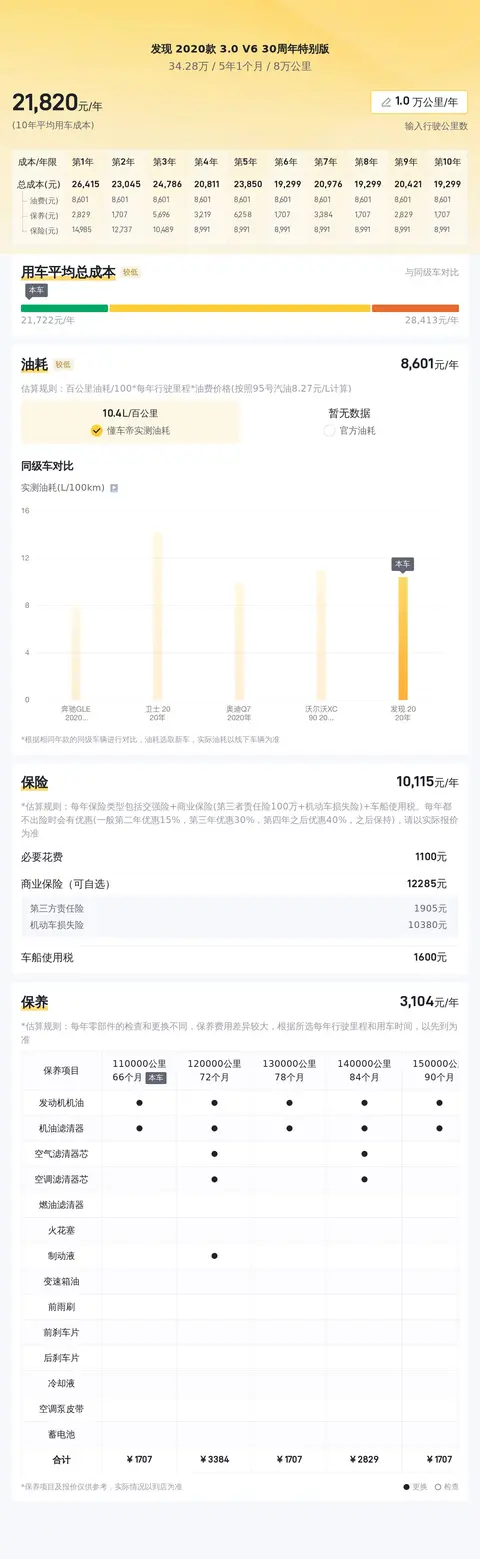 据估算,同级车的最低用车成本是17988元/年,最高是27726元/年,发现 2020款 3.0 V6 30周年特别版是22055元/年,用车成本适中。