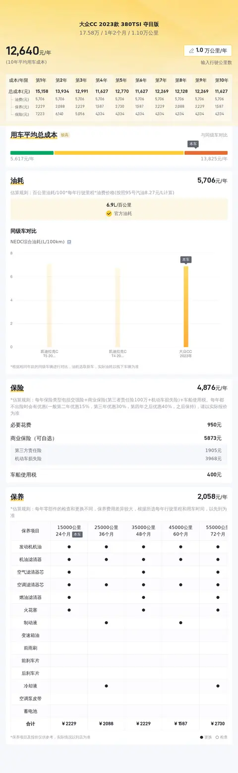 在用车成本部分,根据估算,这辆车的年均综合用车成本约1.3万元左右,不过这个跟每位车主的用车习惯不同还是有着很大差异的。