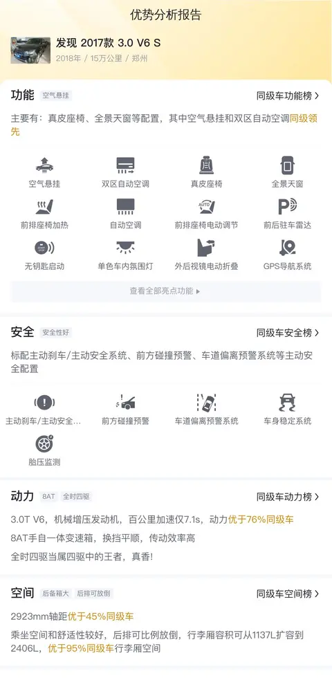 综上所述,今天介绍的这辆二手路虎发现目前售价为24.98万元。这款车在配置、动力、空间等方面均表现出色,无论是豪华舒适性还是驾驶性能都达到了较高水平。在目前的车况下,这一售价对于追求豪华SUV且注重性价比的消费者来说,无疑是一个值得考虑的选择。