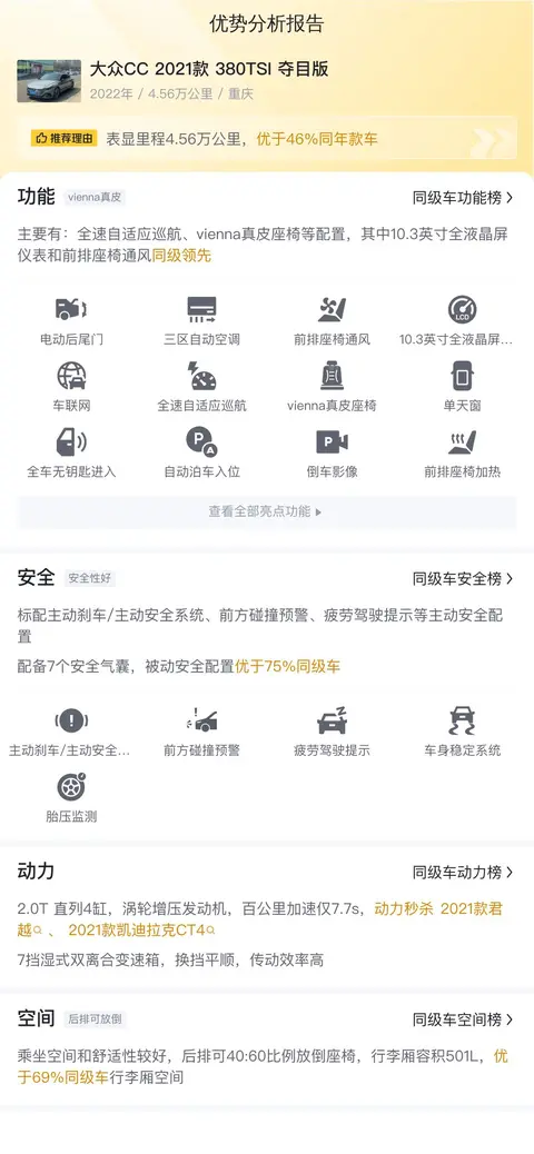 综上所述的新车含税价、用车成本、市场行情、优势分析、同款比价等数据仅供参考。在配置部分,因为二手车非标品,车辆可能会存在配置改装的情况,具体车况信息需要线下结合车辆实际情况进行综合参考。