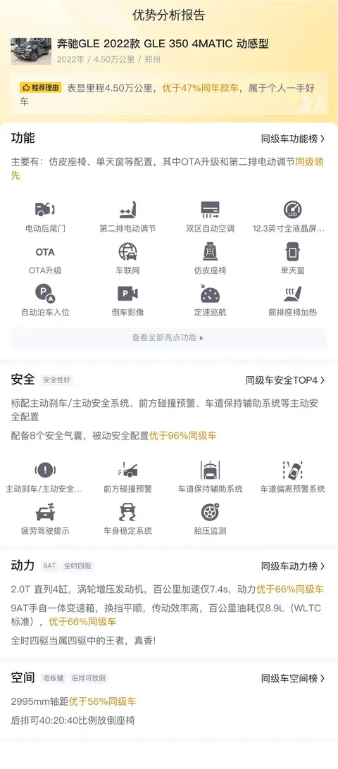 综上所述的用车成本、市场行情、优势分析、同款比价等数据仅供参考,车况信息需要线下结合车辆实际情况进行综合参考。两岁多的GLE,这个车况很新,内饰的豪华氛围也很到位,不管是家用还是商务场合,它都能完美胜任。不过油耗确实大,入手前还需要好好掂量下自己的腰包,量力而行。毕竟不是每个人都能喂得起这只猛兽。