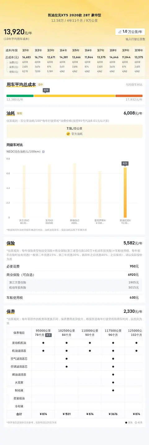 经过对大数据的分析,我们得出了这款二手凯迪拉克XT5的10年平均用车成本约为14181元/年。这一数据基于当前油价为8.5元/L的假设条件下得出,仅供参考。实际用车成本可能会因多种因素而有所波动,包括油价波动、车辆维护状况、驾驶习惯等。在购买二手车时,请务必考虑自身的经济承受能力,并预留一定的预算空间以应对可能的额外支出。