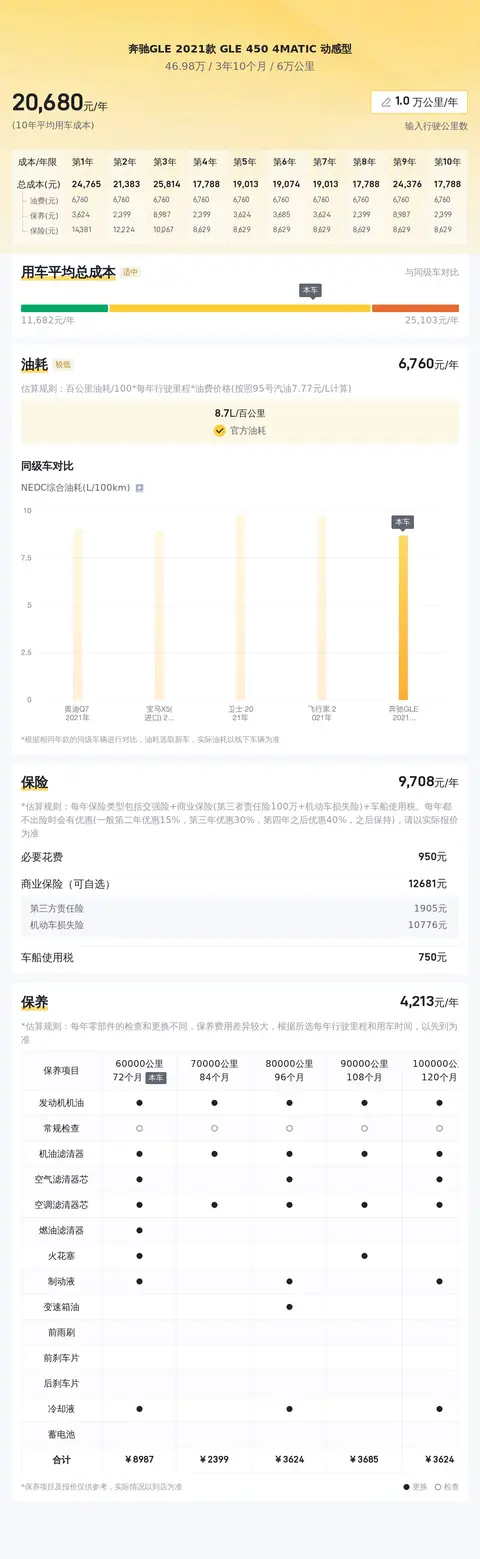 据估算,同级车的最低用车成本是13988元/年,最高是23728元/年,奔驰GLE 2021款 GLE 450 4MATIC 动感型是20604元/年,用车成本不算低。