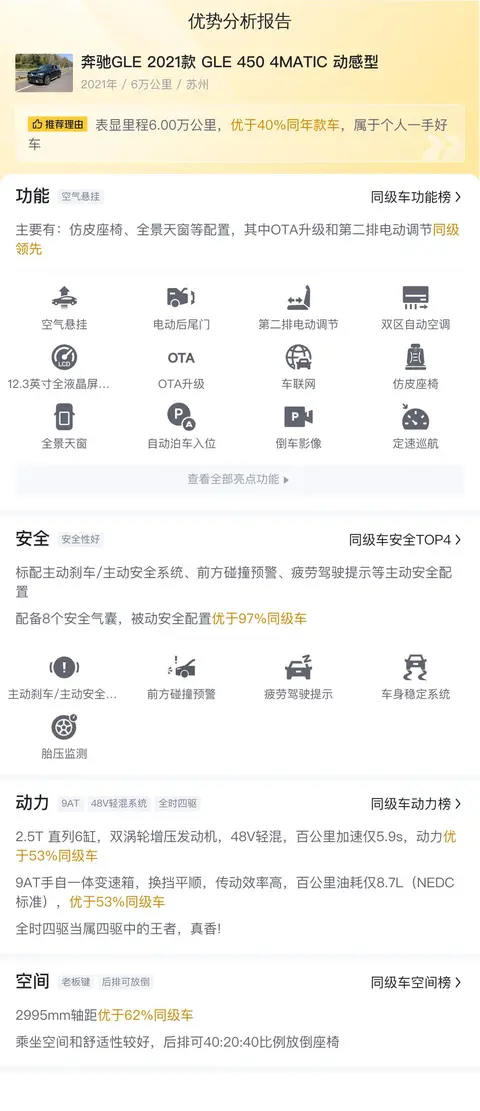 报价相对较低,奔驰GLE 2021款 GLE 450 4MATIC 动感型的市场行情价是42.78万-50.84万,它的报价则是46.98万,价格上有优势,同时保值率也高。