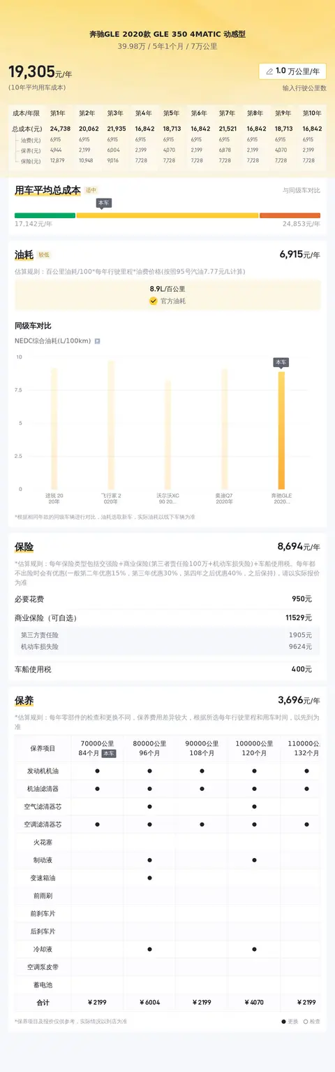 这辆车的10年平均用车成本是19078元/年,与同级别车相比处于适中的水准。官方油耗为8.9L/百公里,根据消费者反馈,实际油耗可能在10.5L/百公里左右,因驾驶习惯而有所不同。保养费用方面,该车的年度保养费用估计为3388元,保险费用参考值为11598元/年,均为正常用车损耗。