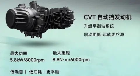 发动机依旧是原来的123.7cc单缸风冷发动机,最大功率5.8KW,最大马力7.9Ps,最大扭矩8.8N.m,极速85km/h,这个动力数据在125的巡航车中显然是不够看的,但是它的定位是自动挡CVT迷你巡航。