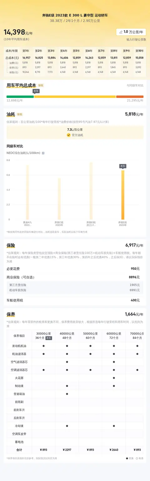 按照懂车帝权威估算,这辆二手奔驰E级的十年平均用车成本约为13682元/年。