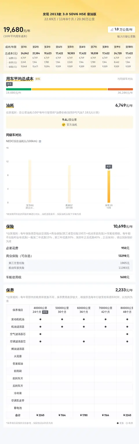 根据估算,这辆二手路虎发现在接下来的五年的平均用车成本大约为每年21,707元,这包括油费、保养费、保险费等。当然,实际费用还会根据您的用车习惯和车况有所不同。
