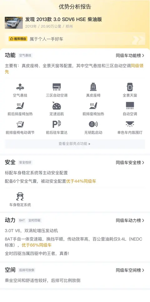 在对比分析部分,我们发现这款二手路虎发现的内外饰用料、后排座椅舒适度和后备厢空间在同级别车型中表现非常出色。车辆采用的真皮座椅不仅提升了内饰的豪华感,还增加了乘坐的舒适度。后排座椅的空间宽敞,能够容纳多名乘客舒适乘坐。此外,车辆还配备了电动尾门和感应式尾门,方便了日常使用中对后备厢的开启和关闭。这些特点都是这款车相对于同级别竞品车型的优势所在。