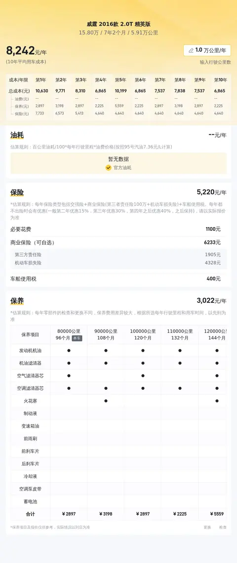 这台威霆 2016款 2.0T 精英版的10年平均用车成本为13386元/年,优于53%同级车,表现不错。