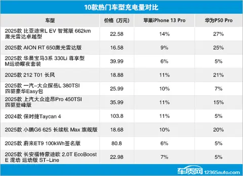 在针对华为P50 Pro的测试中,比亚迪宋L EV、AION RT(图片|配置|询价)、212 T01以及小鹏G6表现相对出色,15分钟内的充电量均达到或超过20%。上汽大众途昂Pro同样支持华为快充协议,在15分钟内的充电量也超过了10%。相比之下,华晨宝马3系、保时捷Taycan、蔚来ET9和长安福特蒙迪欧运动版的测试成绩并列倒数第一,充电量仅为5%。