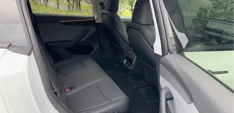 再来看看特斯拉Model Y,同样对于身高1.8米的体验者来说,坐进后排,腿部空间大概有两拳的余量,头部空间有一拳左右的余量。由于造型偏向轿车化,所以头部空间显得有些狭小,后排乘坐感受不如智界R7,但也还可以。后备箱方面,常规容积是822L,后排座椅完全放倒后有2022L,无论是日常还是自驾游的装载需求也都能够满足。车内储物空间则是有扶手箱、储物格这些。