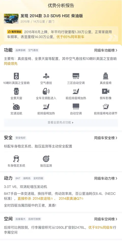 今天我们介绍的这台发现2014款3.0 SDV6 HSE柴油版,新车含税价为96.91万,现在的二手车报价是27.8万,比新车含税价优惠69.11万。外观为绿色,上牌地是福建厦门,2015年6月首次上牌,过户3次。累计行驶里程是14万公里,该车符合国IV(国三)排放标准。