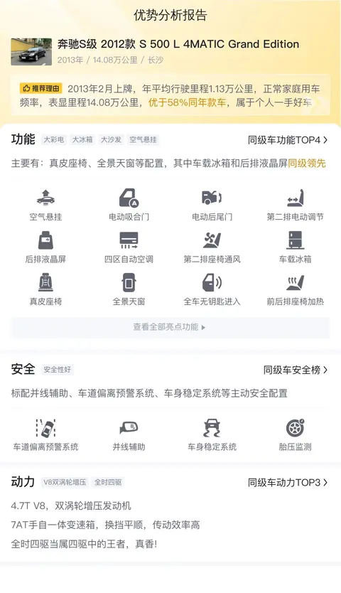 另外,根据估算,同级车的最低用车成本是23709元/年,最高是47718元/年,奔驰S级 2012款 S 500 L 4MATIC Grand Edition是37680元/年,也比较低,这与它的油耗低有关。
