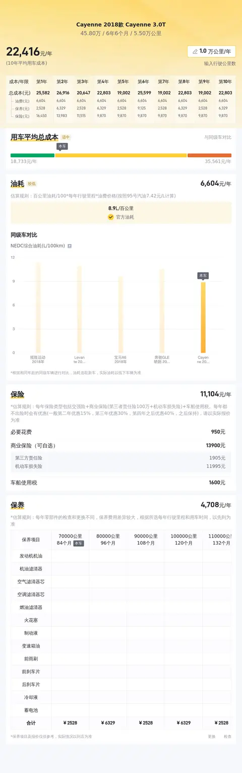 接下来,我们来谈谈大家比较关心的市场行情和用车成本部分。当前这款二手保时捷Cayenne的市场行情价在45.92万-57.25万之间,当然具体的价格还得要看具体的车况表现和售价了。