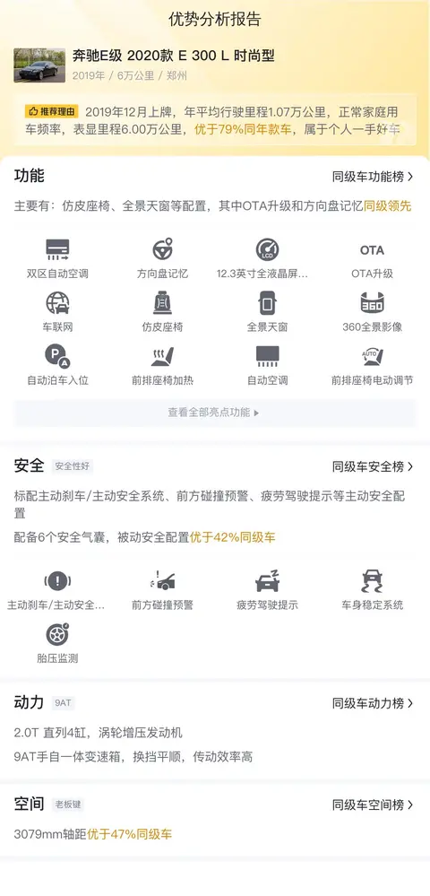 这辆车的优势方面,我认为主要是配置和动力。配备了很多实用功能,像能自动刹车的系统,在关键时刻可能就会避免一场事故;而方向盘记忆,每次上车都能习惯性的调整到上次自己舒服的位置。至于动力,2.0T的发动机以及9AT的变速箱,这个动力组合在同级别并不差,无论是起步还是后续的加速都来的很轻盈。缺点的话,其实这个车龄和里程数,还谈缺点有点吹毛求疵了,如果说非得找点问题,那就是有车主反映奔驰E级的保养费用相对较高,当然这个也跟使用情况和所在地区会有所不同。