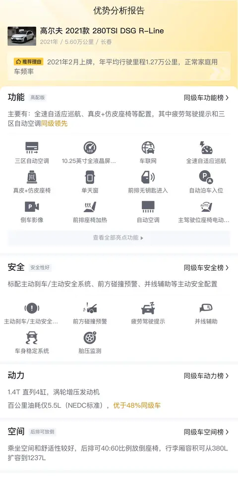 大家是不是对这款车还不是很了解?让我来简单介绍一下,2021款高尔夫280TSI DSG R-Line搭载了一台1.4T涡轮增压发动机,最大功率150马力,最大扭矩250牛·米,配合7挡双离合变速箱,官方百公里加速时间为8.6秒。NEDC综合油耗为5.5L/100km。这款车的动力表现和燃油经济性都相当不错,既保证了驾驶乐趣又兼顾了日常使用的经济性。是一款适合日常代步和长途旅行的两厢车。