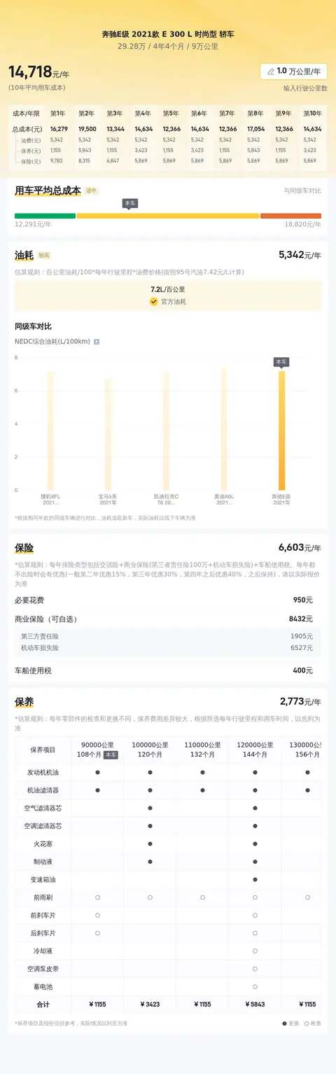 接下来,我们来看看这款车的市场行情和用车成本。目前,这款2021年奔驰E级的二手车市场价格区间在26.04万至31.97万之间。当然,具体的售价会受到车辆状况等因素的影响。关于用车成本方面,根据估算,这辆车的年均综合用车成本大约在1.5万元左右。需要注意的是,实际费用支出可能会因个人使用习惯及维护情况而有所差异。