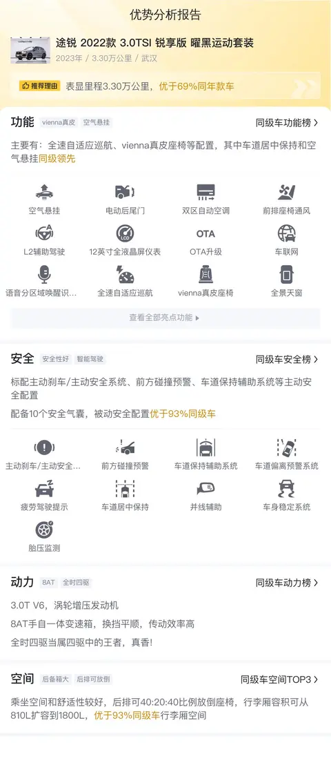 综上所述的新车含税价、用车成本、市场行情、优势分析、同款比价等数据仅供参考。在配置部分,因为二手车非标品,车辆可能会存在配置改装的情况,具体车况信息需要线下结合车辆实际情况进行综合参考。