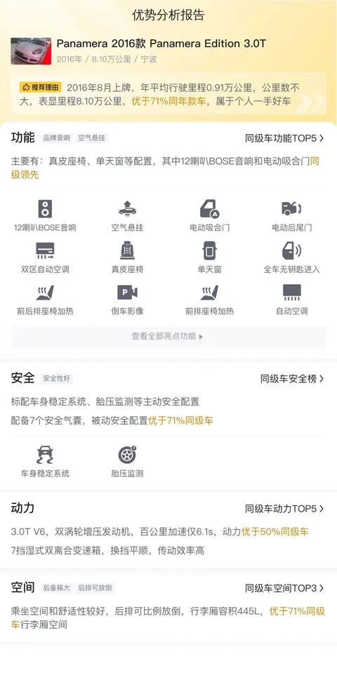 优势:白车黑顶,空气悬挂,电吸门,BOSE音响,都是良好的配置,尤其这个音响对于喜欢听歌的朋友,绝对是一种享受。另外,这辆保时捷Panamera的里程不高,动力强劲,保时捷的品牌名气大,开出去有面子。