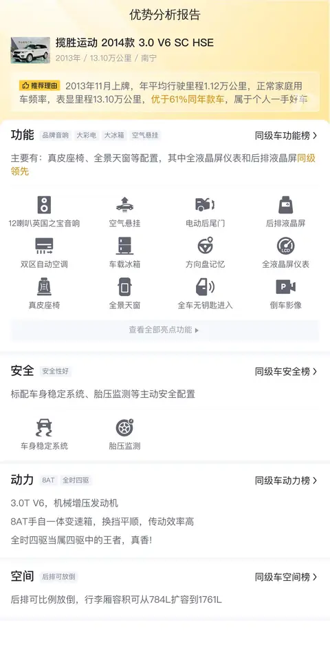 综上所述的新车含税价、用车成本、市场行情、优势分析、同款比价等数据仅供参考。在配置部分,因为二手车非标品,车辆可能会存在配置改装的情况,具体车况信息需要线下结合车辆实际情况进行综合参考。