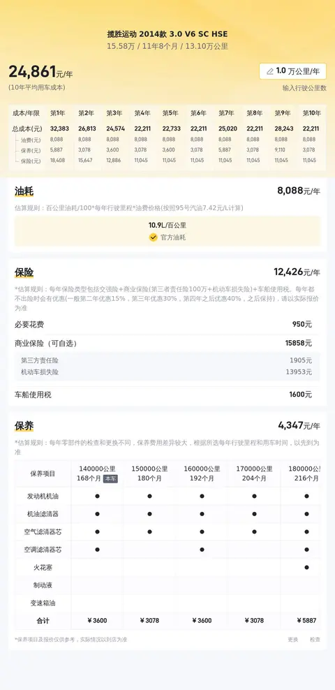 另外,据估算,该车的用车成本也不低,因为同级车的最低用车成本是21709元/年,最高是43786元/年,而揽胜运动 2014款 3.0 V6 SC HSE是25278元/年。