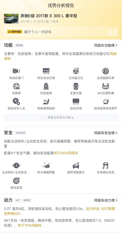 该车具体版本为2017款的奔驰E300L豪华型,上牌地为浙江杭州,上牌日期2017年8月,表显里程12.70万公里,新车指导价49.98万,二手车报价18.88万,过户次数0次,车身颜色为黑色。