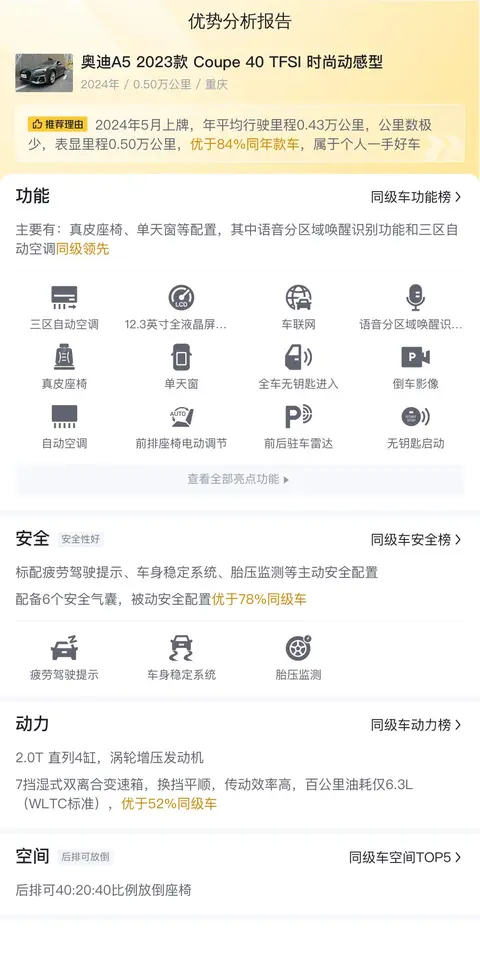 本次我们要介绍的是一辆奥迪A5 2023款 Coupe 40 TFSI 时尚动感型,它属于个人一手用车,未曾经历过过户,历史清晰可查。自2024年5月上牌以来,该车行驶里程仅为0.5万公里,车龄短暂,磨损有限。车身采用绿色涂装,且为原厂漆面,未经翻新处理,更显品质保证。目前,该车位于重庆,作为展销车辆出售。