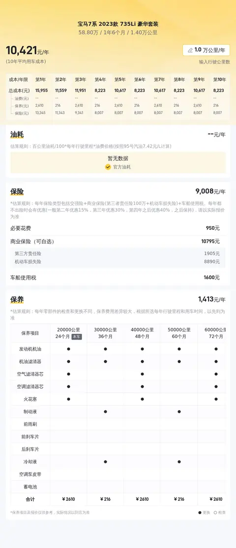 根据懂车帝的大数据分析,这辆二手宝马7系2023款735Li豪华套装的市场行情乐观,当前报价为58.8万元,相较于新车指导价,节省了33.1万元,具有很高的性价比。从用车成本来看,该车按照每年行驶1万公里计算,未来10年的平均用车成本约为20885元/年,对于一款豪华旗舰轿车而言,这一成本在合理范围内。考虑到车辆的保值率,预计未来几年内,该车的二手市场价格将相对平稳,适合长期持有。