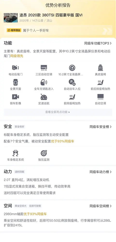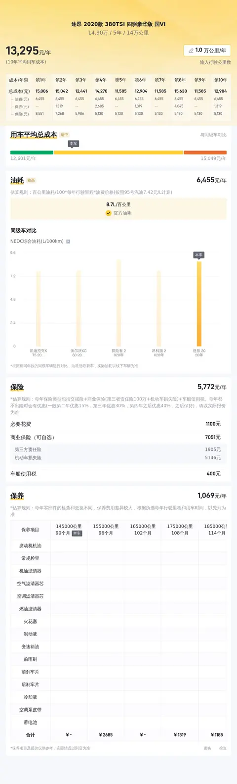 选择买车,肯定还要考虑用车成本,以及日后的用车成本是否会增加。根据估算,同级车的最低用车成本是12745元/年,最高是18771元/年,而途昂 2020款 380TSI 四驱豪华版是12970元/年,所以用车成本较低。从数据上来看,这辆车日后用车成本应该是稳定的,不会出现忽高忽低的情况。