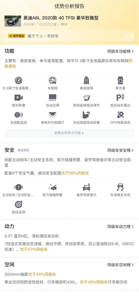 根据当前市场行情,这款奥迪A6L的二手车价格区间在17.08万元至20.67万元之间。而该车的报价为19.98万元,虽然偏高,但考虑到其较低的里程数(10.2万公里,低于同类车均值7.8万公里)和零过户记录,以及较高的保值率(预计两年后仍能保持约13.1万元的售价),这一价格仍然具有一定的市场竞争力。此外,该车作为全国中大型车销量榜Top9,其市场认可度和知名度都相对较高,这也为其二手车交易增添了一份保障。从用车成本来看,该车6.8L/百公里的油耗表现较为经济,按照每年2万公里的行驶里程计算,每年油费约为1.3万元,保养费用约为3135元,保险费用约为4928元,总计约为2.1万元。与同类车相比,这一成本属于合理范围之内,对于追求性价比的消费者来说,是一个不错的选择。需要注意的是,实际用车成本可能会因个人驾驶习惯、用车频率等因素而有所差异。