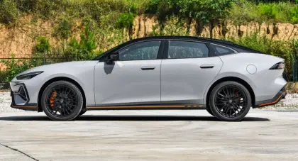 车辆的侧面采用了极简曲面设计,线条十分凌厉,从车头一直延伸至车尾。再加上大尺寸的放射性运动轮毂设计和超大四活塞运动卡钳,视觉上显得十分有冲击力,同时还能有效降低整车的风阻系数。车辆尾部采用了贯穿式的尾灯设计,并配备了电动尾翼,能够根据车辆速度和驾驶模式自动开启。从而为车辆带来下压力,保证了更稳定的高速行驶体验。