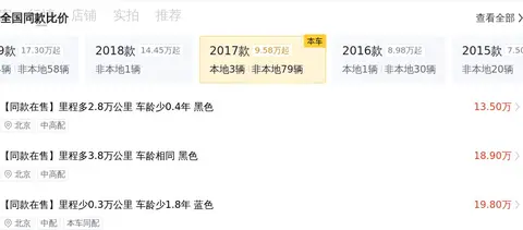 该车与2017年1月在昆明上牌,表显里程9万公里,经历过2次过户,车身黑色,报价13.58万。