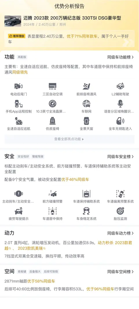优势:德系车底盘给人的感觉就是非常扎实,高速稳,拐弯猛,尤其适合年轻人的驾驶习惯。这辆迈腾 2023款 200万辆纪念版 330TSI DSG豪华型使用了一年多的时间,里程数跑了2.4万公里,车子磨损程度不高,性能良好,可以无缝对接投入使用。价格比新车便宜将近10万块钱,但是配置跟新车比没有太大差别,所以性价比更高一些。