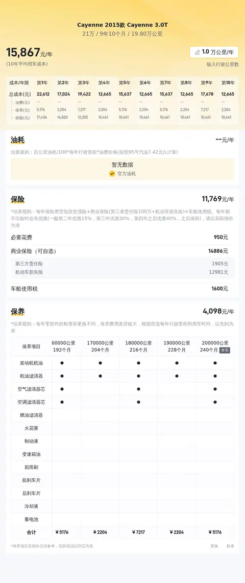 用车成本方面,按一年2万公里计算,该车每年燃油、保险及保养的综合用车成本约21778元,具体费用要看实际使用情况而定。