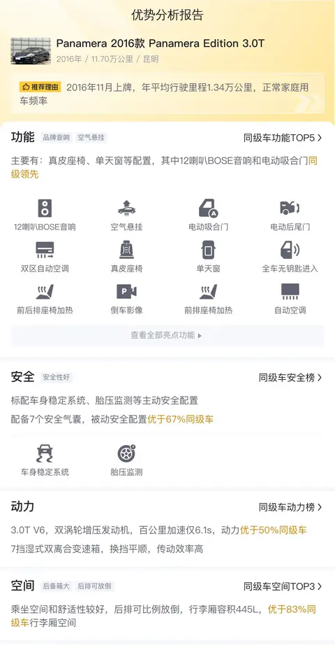 二手车市场鱼龙混杂,导致消费者对二手车望而却步,而懂车帝针对Panamera 2016款 Panamera Edition 3.0T进行了多项检测,所以它具有完整的事故排查检测报告,通过这个报告,你可以清楚的了解到它的车况。
