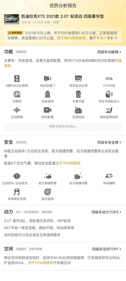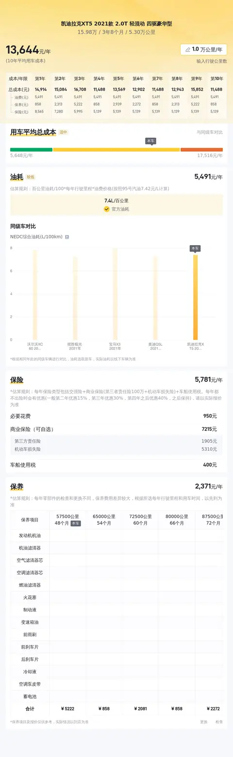 据估算,同级车的最低用车成本是13409元/年,最高是17664元/年,凯迪拉克XT5 2021款 2.0T 轻混动 四驱豪华型是14179元/年,整体适中。