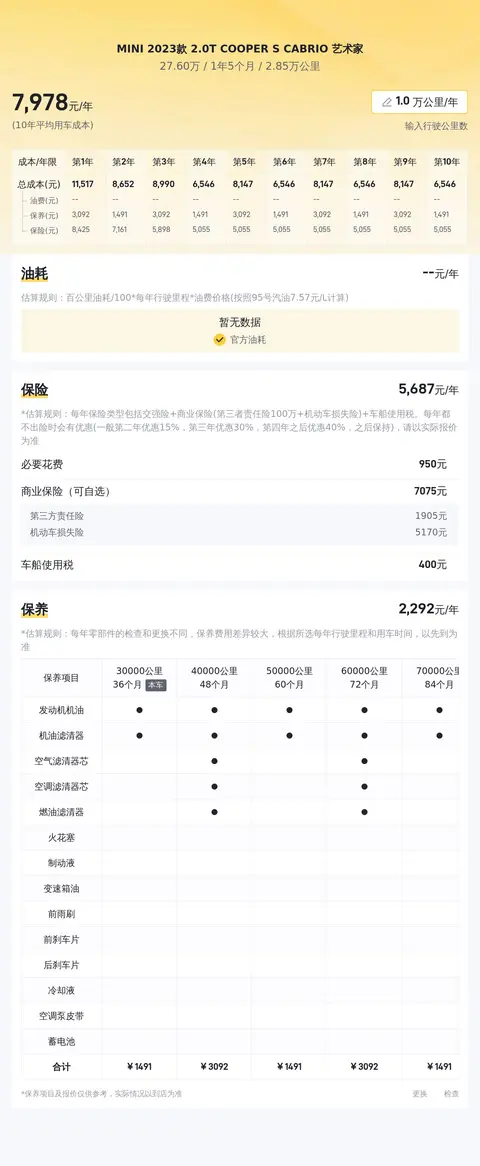 10年平均用车成本是8263元/年,也算是正常花费。