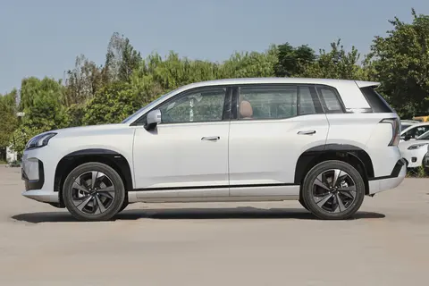 侧面造型方面,车顶线条比较平直,属于力量感十足的类型;腰线采用了分段式设计,点缀出了车身侧面的层次感;门把手则是弹出式设计,属于目前新能源车型常见的设计语言,能够起到降低风阻的作用;轮眉和侧裙部分设计有粗壮的黑色饰板,凸显了力量感;轮毂则是五辐式造型,风格还算简洁。