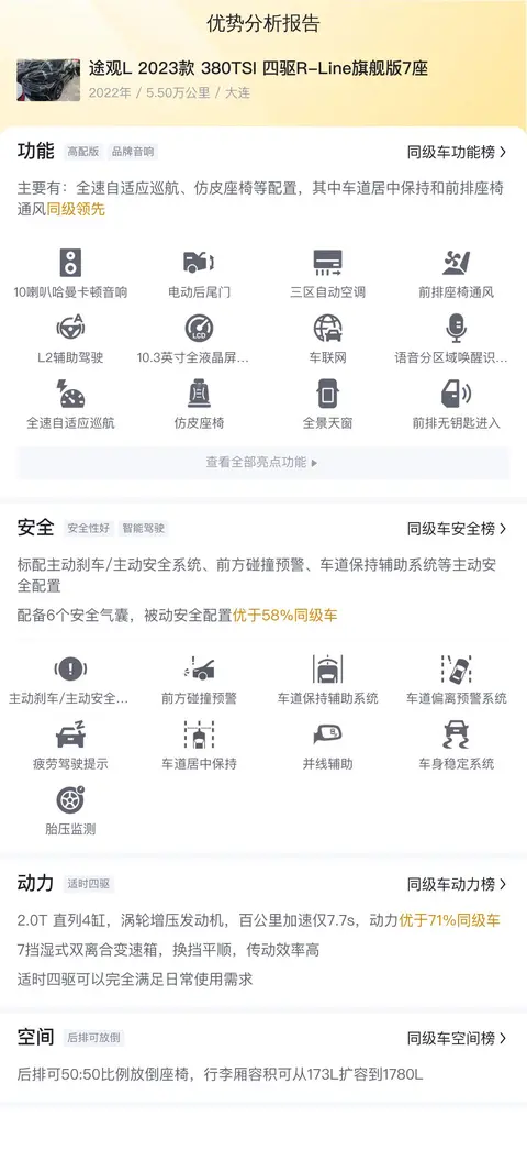 综上所述,这辆途观L 2023款 380TSI 四驱R-Line旗舰版7座是一辆集豪华、舒适、安全和动力于一身的二手车。它不仅拥有出色的外观和内饰设计,还配备了丰富的配置和强大的动力系统。在同级别车型中,其性价比和竞争力都非常高。如果你正在寻找一款既能满足家庭出行需求又能展现个人品味的SUV车型,那么这辆途观L绝对是一个不错的选择。